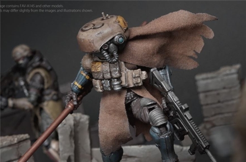 This 3.75-inch articulated figure of the "FAV-A145 Soker" stands approximately 15cm tall, showcasing the unique style of the Tu Gui tribe with its full set of equipment. It includes a distinctive wide hood, a cloak to protect against sandstorms, shoes resembling animal claws, and a homemade battle spear. Accessories include a TAR-37 assault rifle, a T-82 combat knife, an L&D MW-90 pistol, and a tactical backpack. Additional interchangeable head sculpts are also included, allowing for various combat-ready poses.