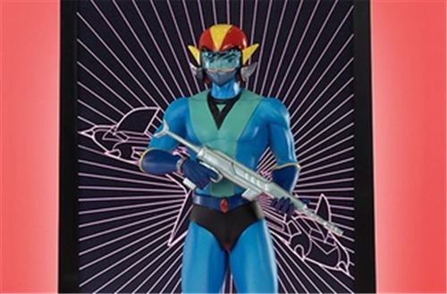Koji is depicted wearing his iconic helmet, embodying the bold pilot and loyal ally he is to Duke Fleed. Calm, confident, weapon in hand, he stands ready to launch into battle against enemy forces. The Double Spazer spins through the background, ready to join Grendizer and dock with the robot.