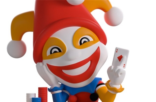 Ready to play? How’s your luck? Jimbo has arrived at Youtooz to see if you can set a new high score with his debut! He sits 4.7 inches tall behind a green and yellow poker table, with soft lighting in front of him. His head rests on his gloved right hand, and his white face is painted with red and orange makeup that matches the three-pronged trick hat on his head. He holds an Ace of Diamonds between his fingers in his left hand. He wears a red, blue, and orange shirt with a ruffled collar and fringed edges, along with colorful trousers, and three piles of chips beside him. The outside of the package features a poker hand full of Aces with an Ace in the center, while the inside shows playing cards scattered on a swirling blue background. Then it turns a vibrant red, covering the protective sleeve, and the front of the package has a large, clear window showing his image. This collectible comes in a matte embossed protective bag and a custom-sized plastic protective cover for maximum protection during shipping.