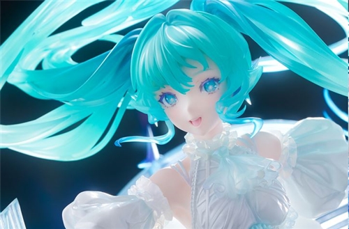 Illustrator Taiki has created an original illustration of Hatsune Miku, the virtual singer who enjoys immense popularity both in Japan and overseas. This figurine is based on the original crystal-themed illustration. The fantastical colors and crystal-like texture of the original illustration have been faithfully reproduced. It is made from a transparent material that allows you to feel the refraction and sparkle of light.