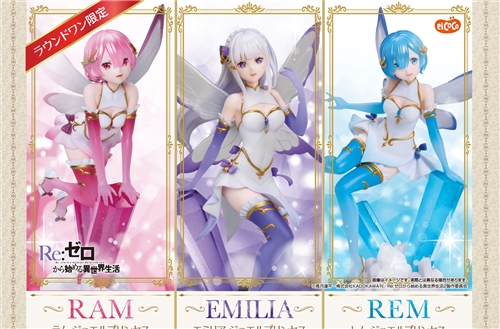 From Elcoco, Emilia, Ram, and Rem from the anime "Re:ZERO -Starting Life in Another World-" are turned into figures dressed in original costumes and looking as adorable jewel fairies! These 1/7 scale amusement prizes (hereafter referred to as "prizes") will be rolled out to Round One amusement facilities nationwide from March 2025.