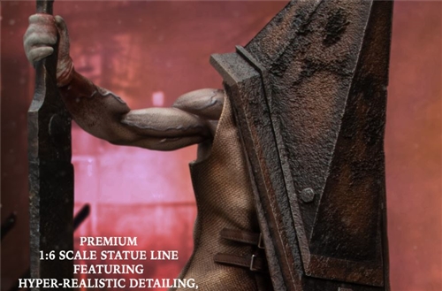 The Mezco’s Static Six: Silent Hill 2 – Red Pyramid Thing statue is based on the nightmare-inducing Silent Hill 2. The gruesome headsman wears weathered work pants and stands menacingly atop a decaying Brookhaven Hospital. Red Pyramid Thing is ready to strike with his Great Knife or Great Spear, which he holds with his interchangeable right hand and can be swapped onto his interchangable right arm for a multitude of different poses.