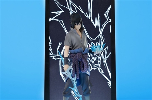 Sasuke appears wearing his early Shippuden outfit, frozen in a cold and controlled stance, sword in hand. His gaze and presence evoke his dark journey and relentless quest for power. Kirin asserts its full might in the background, enveloping the scene in an electrical energy that is both elegant and destructive.