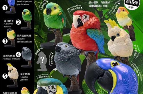 They are African gray parrot, sunflower parrot, purple-blue macaw, red-green macaw, yellow-blue macaw, white-bellied Keke parrot, black-headed Keke parrot, blue-topped parrot and hidden models [the whole set has 10 % chance to hide and randomly replace a normal model]