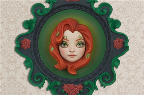 This elegant sculpted cameo transforms the artist’s signature “Bun” doll face into the infamous floral femme fatale, surrounded by her signature red hair. Framed by green filigree, a black border, and delicate rose flower accents, this mesmerizing Poison Ivy portrait draws you in to her domain with delicate leaves, earth-tone eyeshadow, and a dusting of freckles across her face.