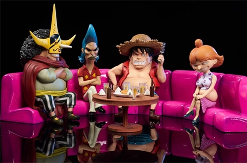 This statue includes Demaro Black (Luffy)+Manjaro (Zoro)+Chocolat (Nami)+Mounbleten (Usopp)+Turk (Francky)+Drip (Sanji)+Stray Fox (Chopper)+Cocoa (Robin)+Sofa.
