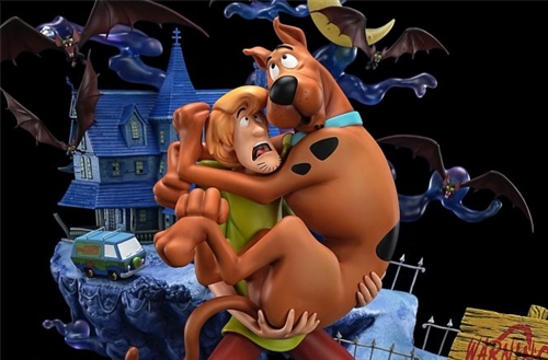 Scooby and Shaggy are depicted in this diorama statue in one of their most classic poses, with a disturbing haunted house in the background in perspective. Made in 1/6 scale, the resin statue will be 42 cm high.