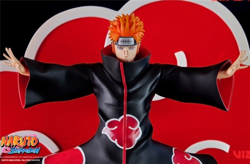The figure is dedicated to Pain , the leader of the akatsuki, emblematically proposed as he prepares to throw the Shinra Tensei. As you may have noticed, the sculpture has no base but is equipped with a background that reproduces the iconic red cloud of the Akatsuki. It is precisely this background that is the basis of the figures since it is the first production for the Breach line of the company, dedicated to Wall Art . The statue will need to be hung on the wall to be exposed, using the special supports on the back. The PVC sculpture will be in 1/8 scale , approximately 25 cm high.
