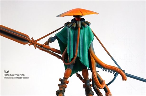 In addition Jaak’s mysterious hooded look with killer assault rifle, the statue comes with a kasa (hat) and a lethal spear. An extra pillar-base to display your switch-outs, will also be included.