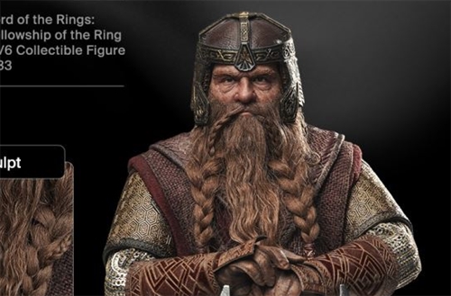 The figure, approximately 29 cm tall with a base , reproduces the proud dwarf son of Glóin with an extremely high level of realism, thanks to the use of hair and an implanted beard with moving eyes. The body has been specifically designed to respect the character's compact and robust proportions, while maintaining good articulation.