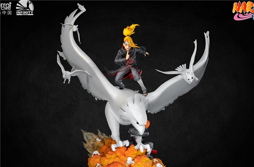 This figure is based on the Three Tails arc where Deidara and Tobi team up. Infinity Studio has captured the moment where Deidara was riding on the clay bird while his partner Tobi clings to the bird's leg tightly, adding some elements of comedy to the scene. But this does not prevent Deidara from also being exhibited alongside the Sasori statue from Infinity Studio.