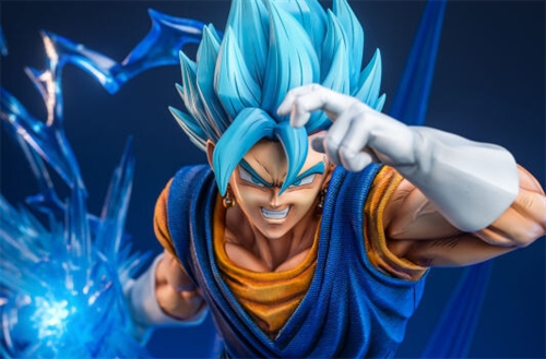 Sculpted in resin with a height of 57 cm , the statue depicts the Saiyan warrior, born from the fusion between Goku and Vegeta, as he throws himself into the attack, loading a sphere of energy in his right hand. The effect can also light up using LEDs . There will also be 3 heads that depict the various stages of transformation of the character: from basic to Super Saiyan and Super Saiyan Blue.