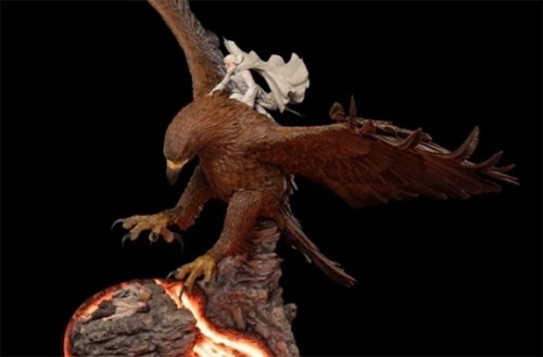 This time, the three-dimensional statue with a height of 101 centimeters fully reproduces the tearful scene in the play. The huge Guan He is about to grab the Hobbit and fly away from here. The richness of the feathers, the sharpness of the beak and claws are all very well portrayed, and the surrounding rocks are used to make the dynamic sense of Guan He's descent more realistic, the dancing sense of Gandalf's white robe on the giant eagle's back, and The state of Frodo and Sam's ragged clothes and exhausted energy is also carefully represented. The magma conveys a high-heat and flowing visual effect under the interaction of exquisite painting and luminous function, which is really an epic masterpiece.