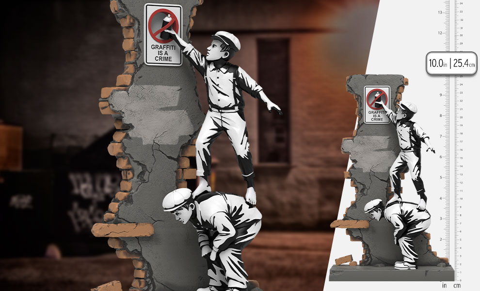 Introducing the stunning Graffiti Crime by Brandalised! Fuelled by their youth and a sense of rebellion, the detailed 10” polystone art collectible depicts two mischievous boys, one atop the other, pulling a spray can out of a “Graffiti is a Crime” sign. Featuring the stencil-like paintwork you’ve come to love with our Brandalised collaborations, Graffiti Crime also features incredible detailing - from every crack to every brick. Even the spray can is popping out and restrained by the sign that imprisons it. Own an iconic piece of street art like never before.