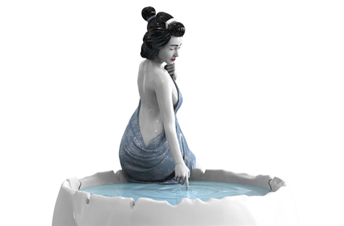 A gentle geisha toys with the pool of her mind in this incredible piece. Her tender demeanor is juxtaposed with the harsh skull that she sits on. Her mind is as deep as the ocean is vast, there's more to this geisha than just a pretty face. What thoughts reside in her mind? Do you dare to take a dip?