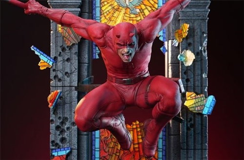 Standing at over 38” high, Daredevil is depicted bursting through a stained glass window, his knees tucked and arms spread wide in an iconic, dynamic pose. Clenched in each hand is a piece of his two-part billy club, his preferred tool for traversing the rooftops of Hell’s Kitchen. Every detail of Ol’ Hornheads costume has been recreated with expert care, from the seams on his red suit to the unique texture of his belt.
