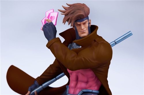 He’s poised to wield his playing cards and bo-staff with stunning accuracy. Gambit’s finely sculpted portrait and expression are just as beautifully painted as the vibrant colors of his costume, bringing this statue to energetic life.