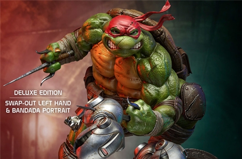 The Raphael 1:3 Scale Statue – Deluxe Edition includes a swap-out portrait with a full red bandana cap with alternate eyes. He also comes with a swap-out left hand holding a skewered Mouser on the end of his blade. Change up this battling brother’s signature style with these exclusive added display options.