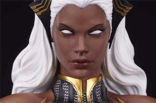 Storm is presented in her signature black suit, complete with mesh and leather-replicating detail contrasted by polished metallic gold accents. Her split cape flows beneath her arms as she raises them to unleash her power.
