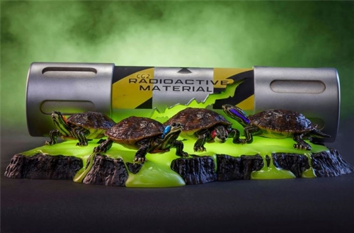 All four beautifully detailed turtles, depicted before their mutations, crawl through the radioactive goo that seeps across the sewer floor from the ruptured canister that anchors the diorama. Each turtle also features a small splash of color on its neck as a nod to the colors they will later adopt in their crime-fighting personas.