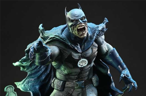 Over 18 inches tall, the Caped Crusader’s undead form is crafted with unparalleled detail and precision. His posture is an unsettling blend of menace and decay. Like those of a zombie, his limbs move with an unnatural stiffness as if struggling against the very fabric of death itself. One arm stretches forward with claw-like fingers, reaching out to claim the souls of his still-living comrades. His once noble features are now contorted into a grotesque mask of terror, from the decaying skin to the dynamic billowing tattered cape; every element is expertly sculpted and painted to evoke terror and fright as he stands atop his tombstone.