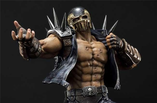 This 27-inch-tall statue of Jagi captures his character’s essence perfectly. He’s opening his jacket with his left hand to reveal his Big Dipper birthmark. His right hand points his shotgun forward. The pose has been chosen to particularly portray his ruthlessness and wicked personality. Many of his features have been carefully recaptured in this statue to represent his character. We are talking about glaring eyes, bulging muscles, and casually sprawled legs. His eyes and mouth peek through his helmet, allowing you to see his complete loss of sanity. The beautiful textures and coloring on his costume is purely a work of art. You can feel the weight of the metal by looking at his massive shoulder spikes and shiny skull buckle. The worn and rough texture of the leather seeps out of the vest and holster.