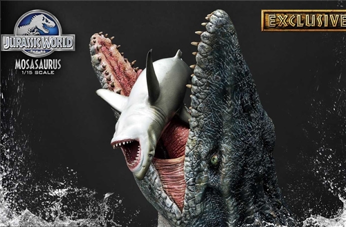 We tried to capture the scene of Mosasaurus consuming a shark and made it into diorama (shark is available only with Exclusive Version). The statue is made with a high attention to details by recreating the skin wrinkles, muscles, water effect to be as perfect as possible in this dynamic pose. This 1/15 scale Mosasaurus statue measures approximately 26 inches tall with over 35 inches wide.