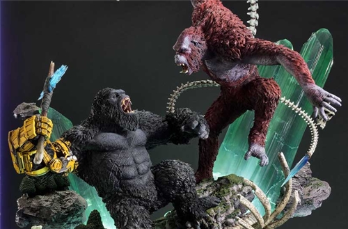 Kong, in search of kindred spirits. Skar King, ruling others through fear. Inspired by their climactic battle, this diorama captures the collision of ideologies that define the two titans. The vertically dynamic composition emphasizes the intensity of offense and defense, while each pose has been carefully crafted to reflect their distinct fighting styles. The battleground has been reimagined from Rio de Janeiro, as seen in the film, to the depths of the Hollow Earth—where ancient ruins and towering crystals elevate the majesty of these colossal beings.
