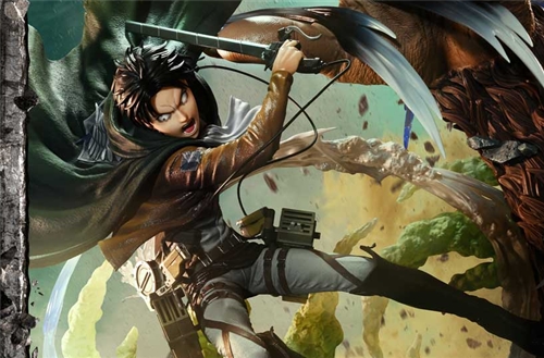 Standing at an impressive height, this diorama showcases Levi's lightning-fast speed and razor-sharp precision as he faces off against the formidable Beast Titan.