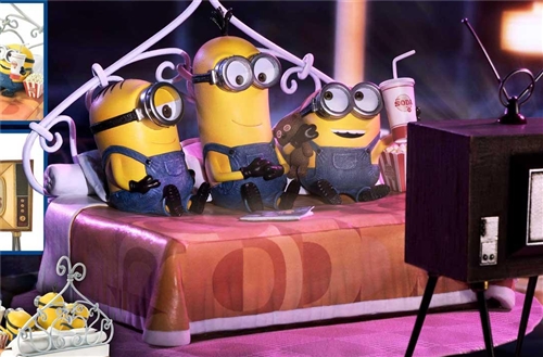 In this Minions TV set, Stuart, Kevin, and Bob are enjoying an afternoon of watching their favorite TV show: The Dating Game! It looks to be that the cyclopean Stuart is about as ready for the show as tall and lanky Kevin. Full of soda and popcorn, Bob looks to be regaling the boys with a story of wonder...or maybe he’s just telling a fart joke.