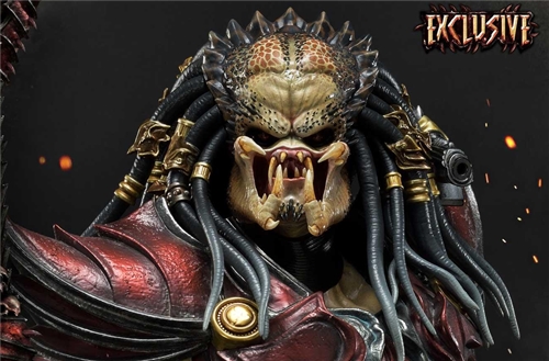 The armor design is from the Sengoku era, the main colors are red and gold which gives a nice vibe of Japanese culture. Predator’s familiar face has more brutal expression compared to other pieces. He is holding the spinal cord in his right hand, and a huge spear in the left. There are human skulls and skeletons scattered at his feet. The statue measures approximately 35 inches tall and is made with a great attention to details.