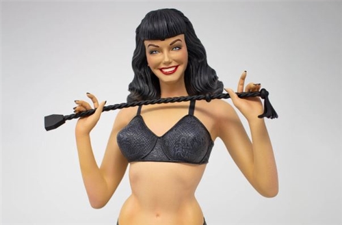 Clothed in black lingerie and bearing a wholesome smile, this statue captures both the naughty and nice sides of Bettie Page. The riding crop is held under just enough little tension to titillate even the most discerning of viewers. Her long and shapely legs are wrapped in sheer stockings and stand atop classic black patent leather pumps. But perhaps the most captivating feature is those amazing blue eyes framed by her trademark bangs. This Quarantine Studios collectible is definitely a statue that will be difficult to resist and will make a handsome addition to your collection.
