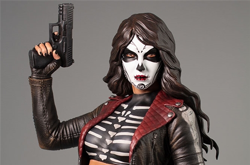 Of course, every soldier needs their war paint and La Muerta didn’t forget hers. A beautiful paste white base coat with beautiful ebony flourishes, blood red lips and eyes that will pierce your soul. She is dressed to kill and toting the hardware to do it too. This collectible statue is ready for action even if it’s just taking over as the center piece in your collection.