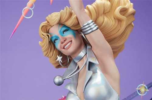 This highly detailed, fully sculpted Dazzler Premium Format Figure presents the world-renowned super hero and singer at the height of her career. Dazzler wears bright blue eye makeup, silver and white jewelry, star-shaped earrings, and a sleeveless pearlescent bodysuit with flared legs while she gives this gig her all. The figure’s base features a metallic disco ball as well as dark purple planetary elements inspired by the iconic Kirby Krackle. Pair the Dazzler Premium Format Figure with the Dazzler Fine Art Print by Lucas Werneck — sold separately — to create a showstopping, pitch-perfect display.