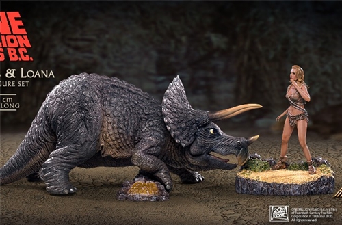 Star Ace salutes the work of Harryhausen with the soft vinyl statues of the Triceratops and Raquel Welch’s cavegirl, Loana. In the film the Triceratops chases Loana but must battle the fierce Ceratosaurus (coming soon).