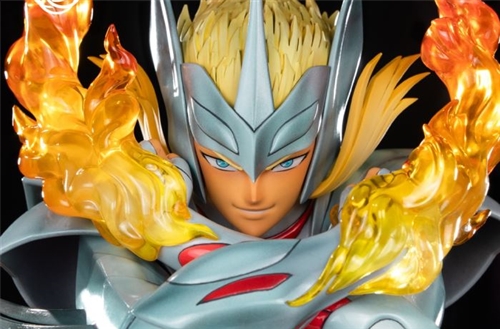 Gemini Kanon is depicted as he prepares to hurl the Lava Inferno, reprising the scene of the fight in the volcano against Hyoga. The sculpture, in 1/6 scale , will have a total height of 36 cm.