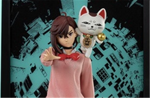 Momo is depicted with Mémé Turbo in its cat form resting on her shoulder, displaying a determined and confident attitude. She embodies courage and resolve in the face of the unknown, never backing down. A stylized building, taken directly from the anime, fills the background, creating an electrifying urban atmosphere and enhancing the visual impact of the scene.