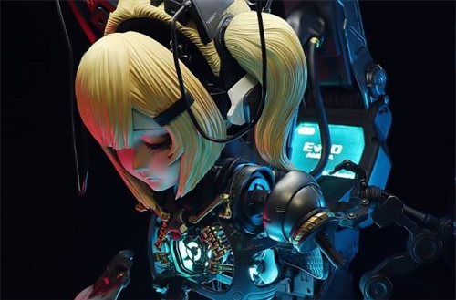 -Work : The bust of the original machine girl Ambra with the white cat "AMBRA is under maintenance"