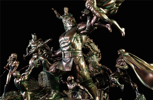 Inspiration and concept behind the Ver B Faux Bronze version: The team was inspired by bronze statues fraught with history, memoralised and displayed in piazzas and museums, and wanted to draw reference from this concept. This Justice League vs Darkseid diorama is not made of bronze but by painting in a faux bronze style, it immortalises the scene as a moment in history. A history of the fight between good and evil, a fight between the Justice League and Darkseid.