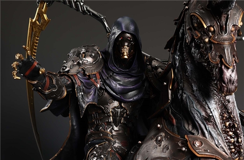 Two (2) head sculpts – 1 head sculpt features Death in a golden skull with fiercely open jaw showing a snarl of rage, and 1 head sculpt features Death with a black mask revealing vicious red eyes