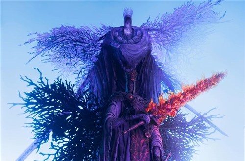 The Greatsword of Judgement shows dark blue hues, deeper than the darkest moon, reflecting sorcerer Sulyvahn's true nature, and the Profaned Greatsword on his right hand bursts into flames, reflecting his burning ambition rooted deep within him.