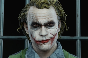 The polystone Joker Premium Format™ Figure includes a fully fabric, custom-tailored costume recreating Ledger’s signature style from The Dark Knight. The dapper and dramatic villain is suited in a green vest over a blue hexagon-patterned dress shirt, along with a green patterned necktie, purple pinstriped pants, and even a pair of multi-colored socks. The clownish killer sits biding his time with an unnerving smirk on his face, his portrait carefully sculpted in Ledger’s likeness down to the worn-in application of makeup and scars of his Glasgow smile.