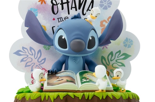 Stitch is depicted sitting with one of Lilo's books while the writing " Ohana means Family " appears behind him , in reference to what is the motto of the film and at the same time its most famous quote. 10 cm