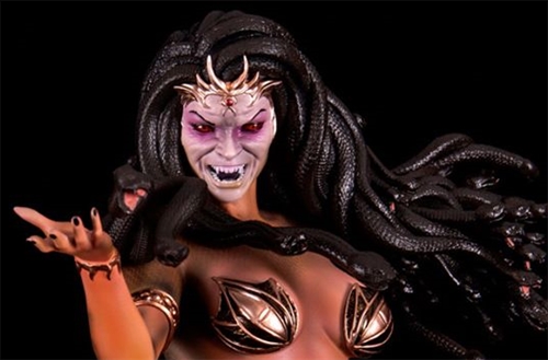 Medusa stands 17.5'' tall with the base and has been beautifully sculpted with all the original characteristics of the ARH original with a few added features. It comes with 2 switch out faces and the breast plates that are removable.
