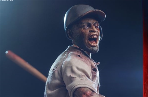 This highly detailed figure features a realistic head sculpt, seamless zombie arms, interchangeable hands, and an array of accessories, including a blood-stained baseball bat, aged batting helmet and shin guards, a first baseman mitt, and a filthy baseball uniform.