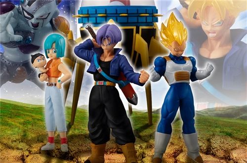 Height: 8.5 cm (Trunks of the Future) / 9.2 cm (Super Saiyan Vegeta) / 8 cm (Bulma & Trunks) / 5.2 cm (Mecha Freezer) / 14.8 cm (Time Machine)