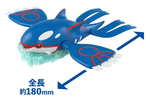 The "Pokémon PLAMO Collection 62 Selected Series Kyogre" utilizes a variety of molded parts and a precise, modular design to recreate its massive body, complete with white spots and red stripes, at approximately 18 cm in length. In addition to the articulated flippers and other articulated parts, the mouth can also be recreated by swapping parts to show its teeth. A wave-shaped transparent stand is also included, allowing you to display Kyogre and depict it swimming on the sea.