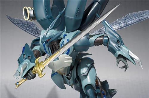 Verbin, who appeared in the illustrated story "Aura Phantasm," serialized in the model magazine "B-CLUB," is now making a comeback in "ROBOT Spirits" 40 years after the serialization began. In addition to the main body and dedicated pedestal, the set includes two sets of interchangeable wrist parts (left and right), an Aura Sword, and joint parts for the Tamashii Stage. The complex shape of the Aura Converter has been meticulously recreated with articulation in mind, and the jewels and engravings scattered throughout the exterior are beautifully rendered in metallic blue and platinum gold.