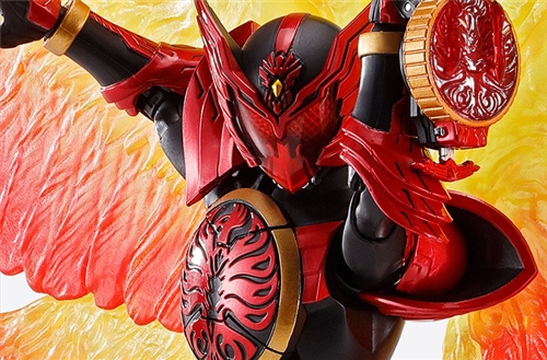 The bird group " Eagle Condor " is the transformation form of Kamen Rider OOO using three core coins of eagle, peacock, and vulture. The bird coin is also the core of ANKH, the partner of Eiji Hino. The appearance of this type is like a fiery phoenix. The head of the eagle has excellent vision to lock the enemy at high altitude, the wrist of the peacock can launch a feathered shuriken, and three pairs of wings can be spread from the back for supersonic flight. When flying, the legs of the vulture The whole body assists in controlling the posture, and produces a vacuum blade when kicking, and unfolds the raptor claws when performing the special move "Prominence Strike". In addition, the eagle-hole and vulture team also has an exclusive shield-shaped weapon "TaJa Spinner", which puts coins into the inner disk to perform various fire-based moves.