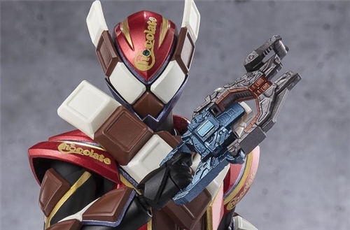 The distinctive chocolate-themed design is recreated exactly as it appears in the film. The body is painted metallic red, and even the word "Chocolate" on the head and shoulders is faithfully reproduced. The "O indicator" on the forehead is made of clear parts, giving it a nice texture. The "Valen Buckle" is also painted in detail.